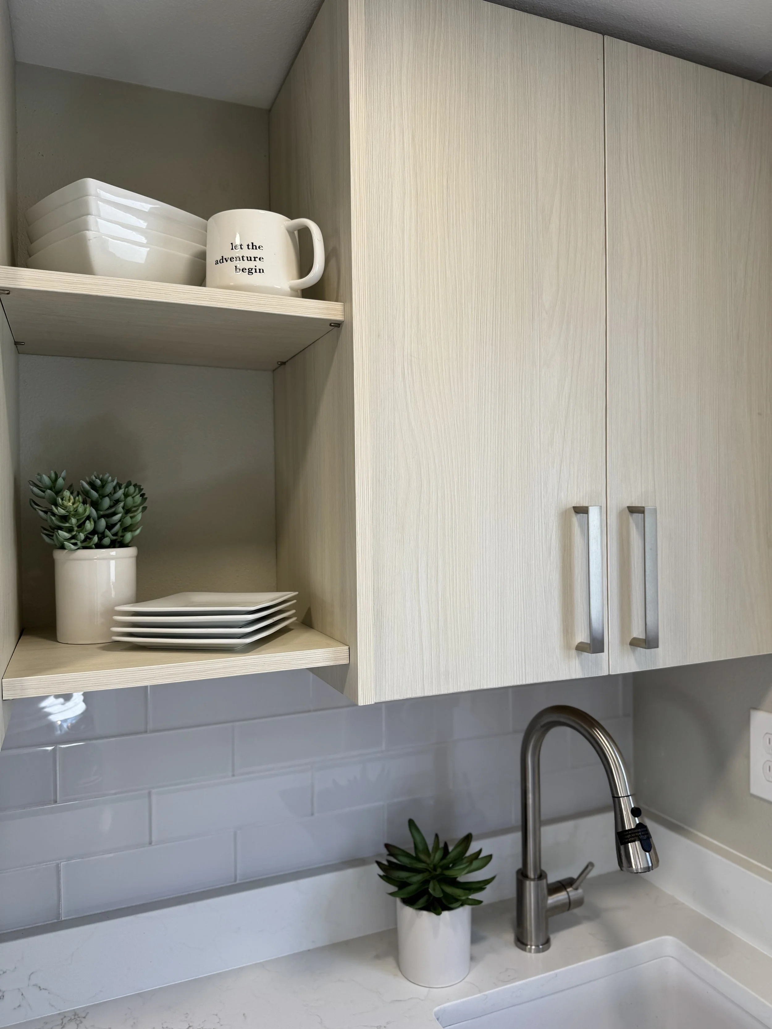 Hello, micro kitchen! This is where it all finally came together and I could see the light at the end of the tunnel. Pretty sure it’ll also be the last time I wrestle with flat-pack cabinets and build them myself — but honestly, so worth it. White oak cabinets, glass tile, and quartz countertops brought it to life, with every inch carefully planned to make the most of this tiny space.