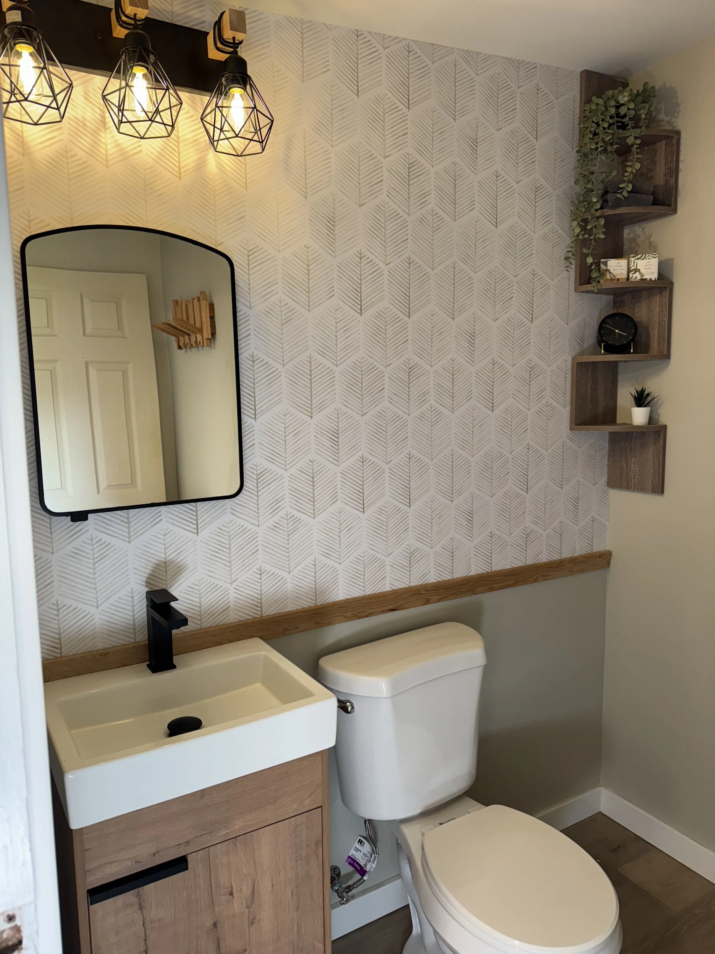Once a bathroom most would have chosen to avoid, has now been reimagined into a compact, yet inviting space. Warm-toned wallpaper brings softness, a light wood vanity adds natural charm, and a cleverly tucked corner shower makes the compact space fully functional