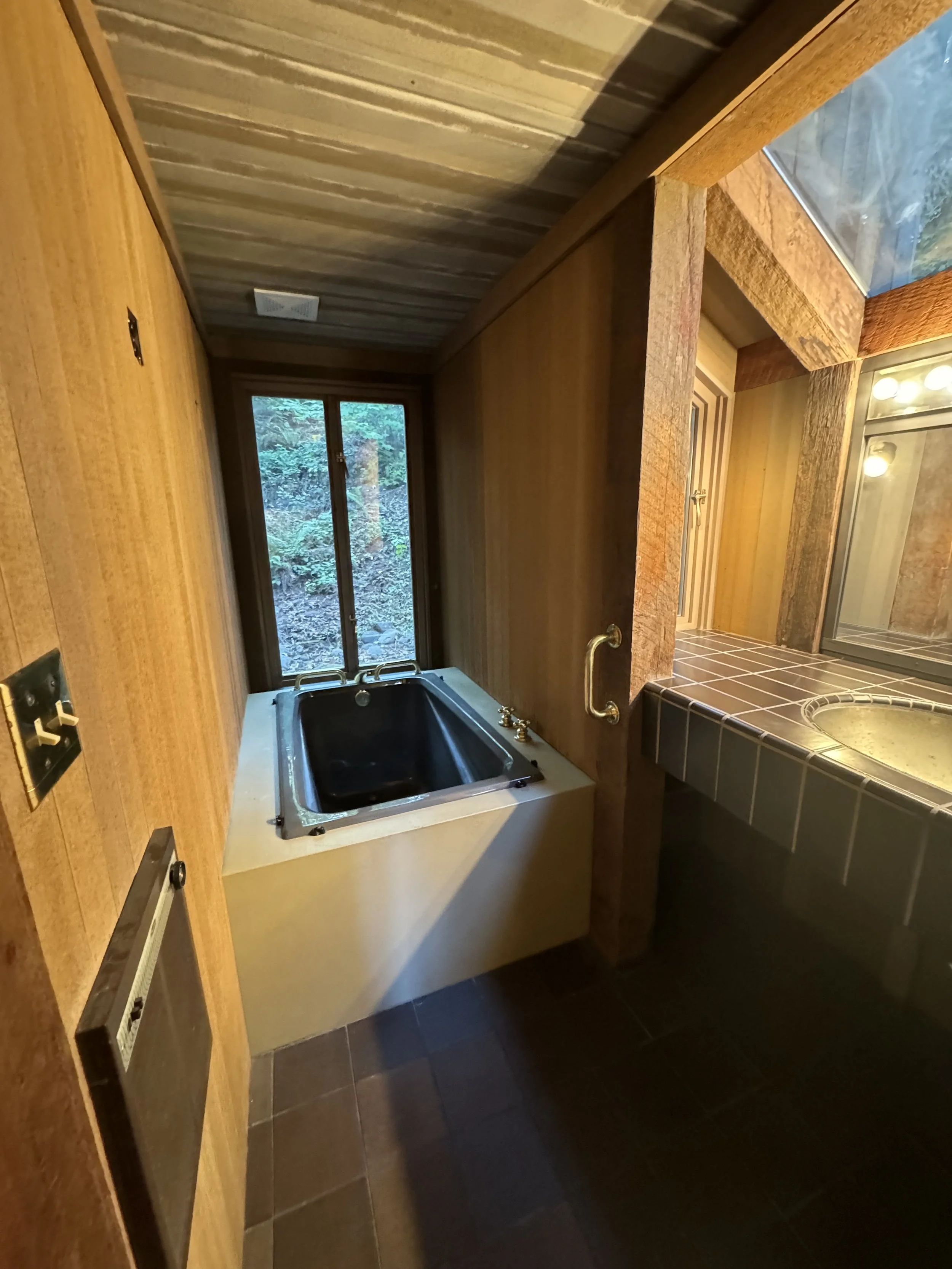 Once I was over the horror of demo… The bathroom was a complete transformation. Out went the outdated micro tub, replaced by a custom walk-in shower that brings a spa-like experience to a compact footprint; light wood cabinets with a custom made mirror with integrated lighting forged in metal to play off the quarts countertops. I left the original bold beams that gave the space such character, just refined them with sand paper and stain.