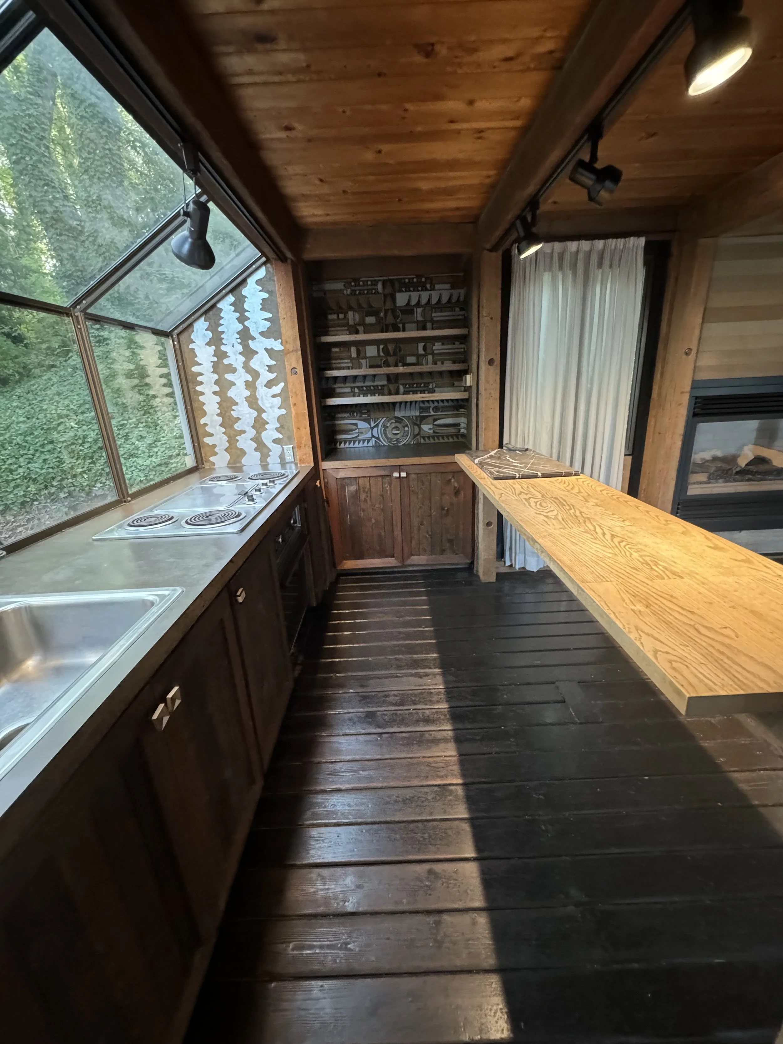 When I reimagined this kitchen, I felt the cabin’s original character — a bit of darkness I knew I needed to preserve to match the home’s aesthetic. The gold-and-silver wallpaper? Let’s just say it had… potential. I did replace it, but I kept the spirit of that boldness alive in a way that fit better. The floors, though, were a gift — the original tongue-and-groove boards, painted over long ago, now uncovered to ground the space in the history of the home