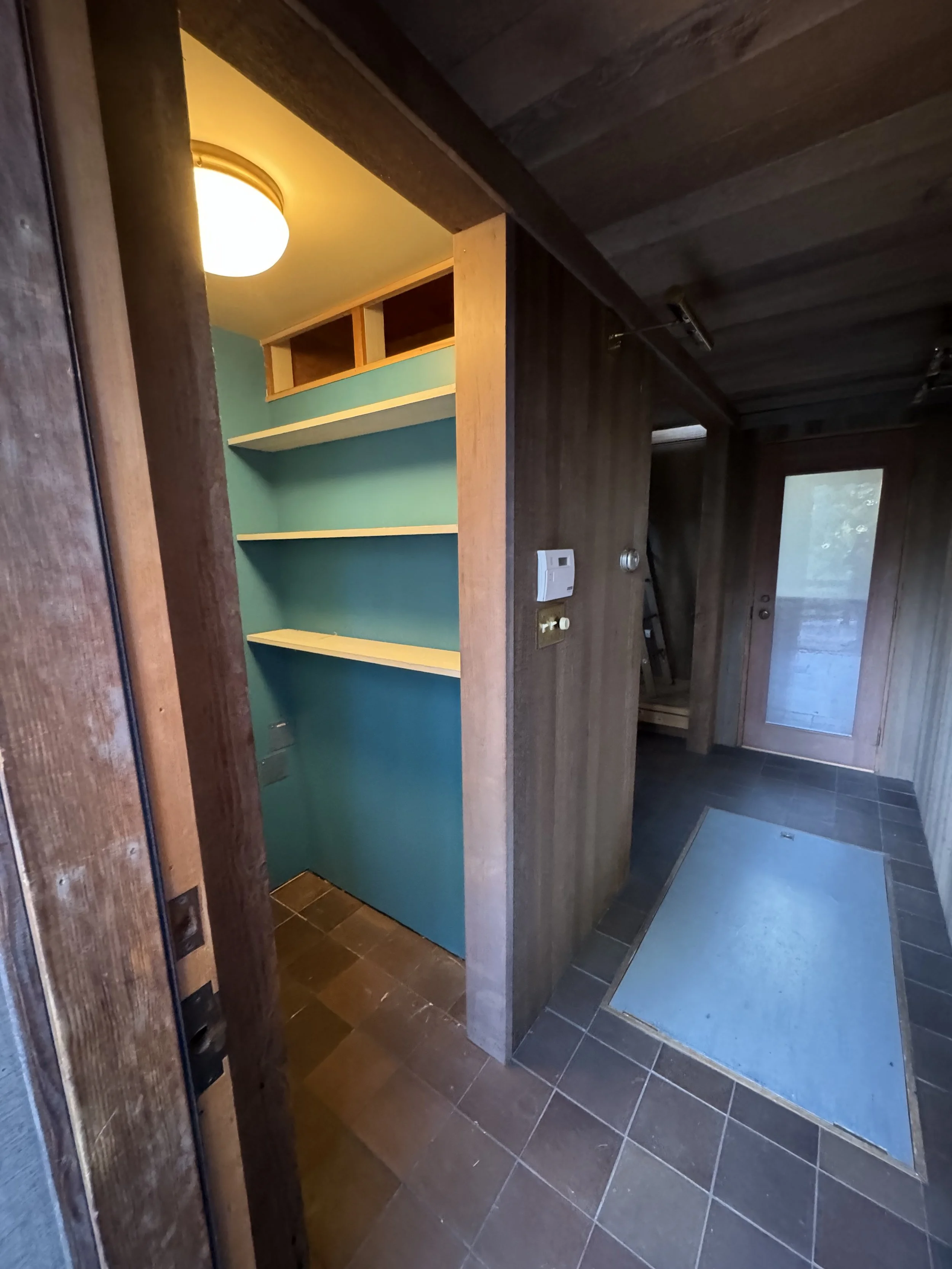 The entryway staircase turned into a cozy little niche with seating, a coat rack, and a shelf for shoes — all built from work surfaces I salvaged from our warehouse. Giving up a bit of entry space felt worth it to create easier access to what would become the Boho Room, now fully framed for privacy and (drumroll)… an actual door! This transformation came with a hefty dose of demo, too, since I also relocated the laundry room in the process