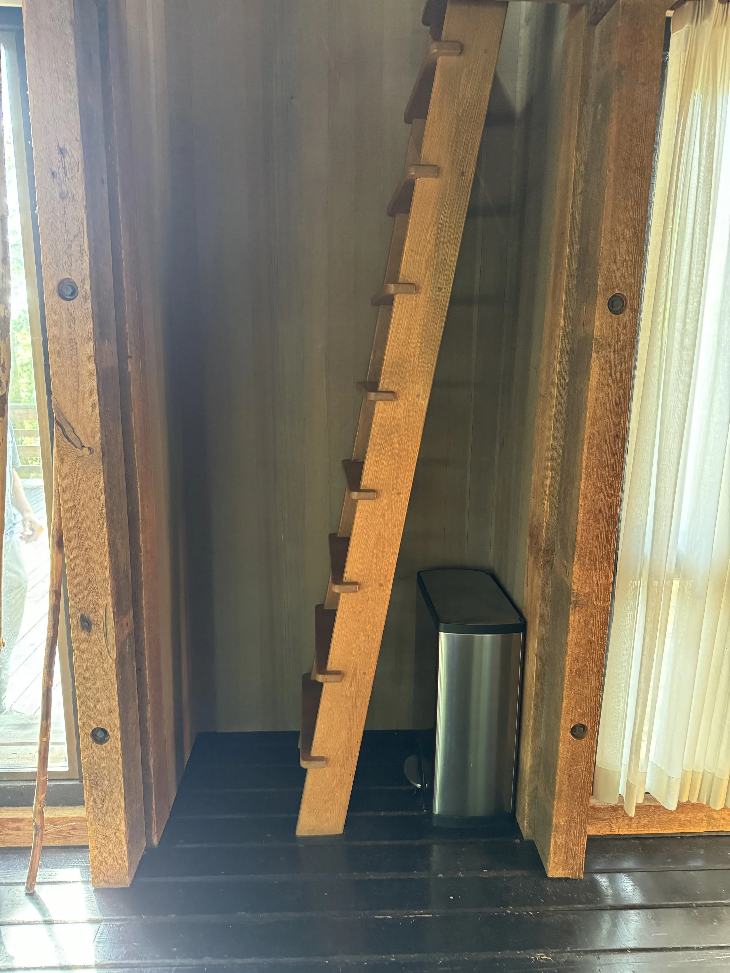 The original access to each loft was by ladder — charming, maybe, but definitely not code-compliant. From the start, my biggest challenge was figuring out how to make the lofts accessible within such a tiny footprint. Cutting too large an opening would steal precious square footage from the bedrooms below, yet leaving it as-is wasn’t an option. The solution? Semi-spiral staircases. They still don’t meet code (there simply isn’t the space), but they strike the perfect balance of function and design in a home this size. In the kitchen i turned the previous ladder access into an open pantry- So perfect for that niche!