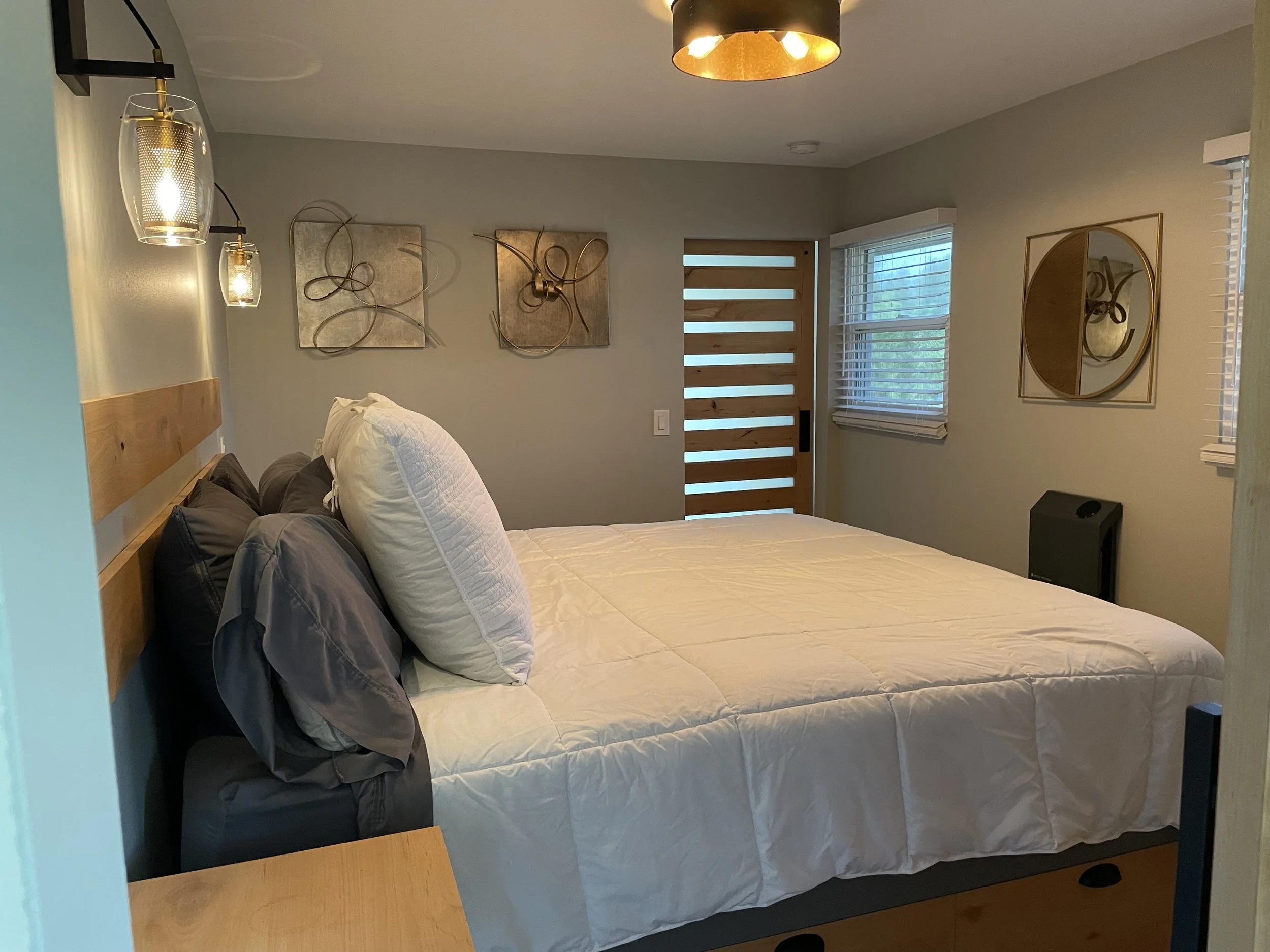 To make the most of the lakefront setting, we replaced the original windows with a 10-foot sliding glass door, opening the home to the outdoors. A cedar deck, privacy screens crafted from corrugated metal, and a saltwater spa completed the vision—turning this once-humble cabin into a tiny luxury retreat.